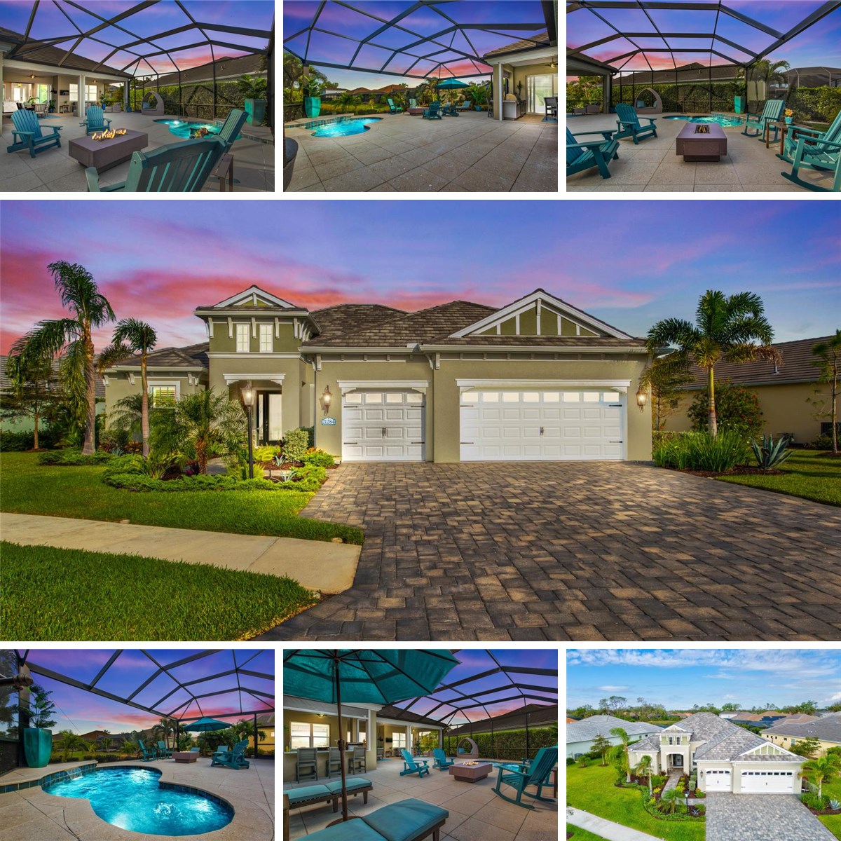 Must See In Person!! Gorgeously custom upgraded and Highly Detailed, This Neal Captiva is their Coastal model with an oversized lot, Waterfront, and Meticulous Landscaping with outdoor Studio Lights, Outdoor Kitchen with Custom Cabinets and Stone Countertop, Lounge area, swim spa, two Full View Screens, Whole House Gas Generator, custom Kevlar Hurricane Shutters, FULL HOUSE Hurricane-Rated Windows & Doors, the list goes on! This home was upgraded to have 4 Bedrooms, 3 full baths, beautiful open concept floor plan with a Spacious guest/club wing. Open concept Living/dining/kitchen, most doors in the home were custom upgraded with Glass, Office upgraded for sound suppression from guest wing, Custom upgraded built-in Cabinets and Shelves for every closet or storage space, Garage Cabinets and Workbench. Gas Appliances. His/Her Separate Vanities for Primary Bedroom. All carpet was replaced, Floors Consist of Tile/Hardwood/Laminate. 10ft Coffered Ceilings, Plantation Shutters Throughout This unique home tells a story! The interior has many well thought out custom design upgrades including wood walls and trim throughout. The roomy floor plan includes a living room which is open to the kitchen and dining area and an additional club room. The gourmet modern kitchen has double stacked upper cabinets, quartz countertops, and stainless appliances with a gas cooktop. The home boasts 10ft ceilings and 8ft doors, with plantation shutters. Guests will love the comfortable private guest suite with full bath. A closet was added to the den which serves as a 4th bedroom. Porcelain tile fills the main areas and the 3 full bathrooms while the 4 bedrooms have hardwood or laminate. The stunning Extended Lanai with waterview incorporates shell-lock pavers, full view screens and a pool/spa "spool" with a gas heater. Use it as a pool with a tanning shelf in summer months to cool off, or as a large spa with seats and therapy jets when you want it to be heated. The custom-built Outdoor Kitchen with stainless steel appliances and granite countertop, along with the cafe, dining, relaxation, lounging and fire pit areas provide a perfect setting for entertaining many guests while viewing Venice's Amazing Sunsets. This home is also equipped with "Hurricane-Rated Windows" and doors and a whole house gas generator. Remote controlled Storm Smart hurricane blinds can provide shade and temperature control or extra protection for the covered areas of the lanai during storm season. Exterior LED lights surround the property and lush landscaping was added all around the oversized lot. Custom pedestal shelves are included with the washer and dryer in the laundry room. More upgrades include: a butler’s pantry, master closet with built-in cabinets from floor-to-ceiling and a large added closet in the hall leading to the large 3 car hard epoxy flaked garage with Tons of Storage Cabinets and shelves and a Workbench. Grand Palm offers countless amenities including walking and biking trails, beautiful scenery, social activities, swimming pools, splash pad, gym, sports courts, dog park, extremely friendly neighbors, an easy and convenient location, natural gas and low HOA fees. This beautiful home has been customized throughout for the new owner to move right in and enjoy the modern, spacious, comfortable, organized, and carefree oasis to host many friends and family members for years to come and make the story their own. Furnishings can be negotiated separately.